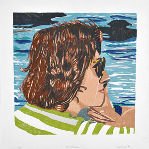 Shark has made two woodcuts, Pu’uhonua and Jackie, at Shark’s Ink. Using the layering attributes of printmaking, these woodcuts deconstruct Shark’s painting techniques to create graphic depictions of her subjects.