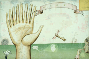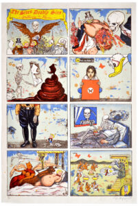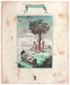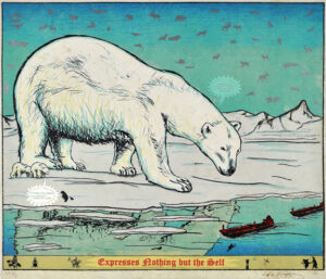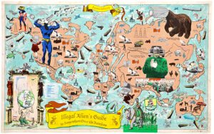 Enrique Chagoya’s print, Illegal Alien’s Guide to Critical Theory, is a personal commentary on current immigration issues. Here the artist depicts himself recovering from a bicycle accident. In a cartoon strip across the bottom of the print, Chagoya (the plucked chicken in a sombrero) rides his bicycle past superheroes and the Border Patrol. Many of the characters have cartoon balloons with “artspeak” quotes from art books and reviews. In this context the quotes become a surreal and satirical self-criticism.