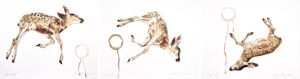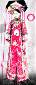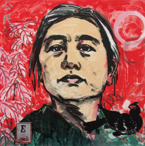 Liu often uses anonymous historical photographs as the subject matter of her prints and paintings. But in her suite, Official Portraits, she presents three self-portraits, each denoting an important period of her life. Proletarian shows a young Hung Liu at the time of the Cultural Revolution, working in the countryside. Immigrant is based on a photograph taken at the time of her immigration to the United States. Citizen brings us up to the present day with a portrait showing Liu as a confident and mature woman of the world. She embellishes the images with lovely drawings of plants, flowers, birds, rats (her Chinese zodiac sign), and painterly drips. Collaged on each print are representations of the ID cards, permits, and ration coupons that have documented her “official” status associated with these portraits.
