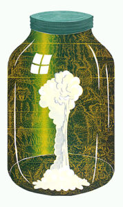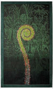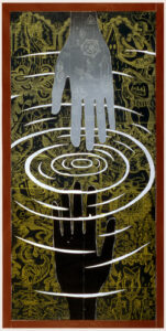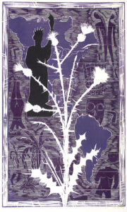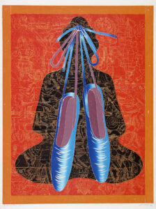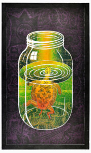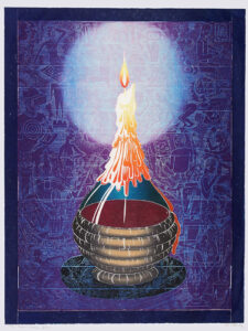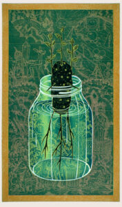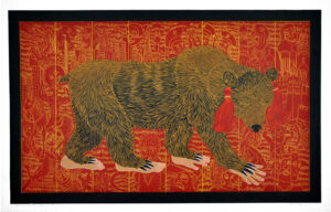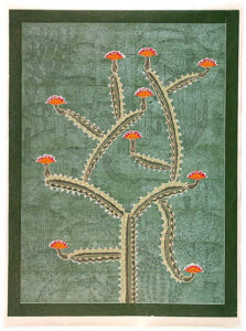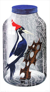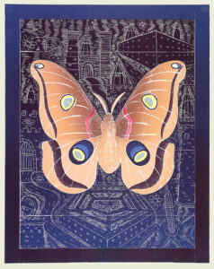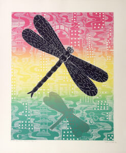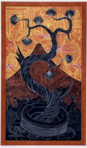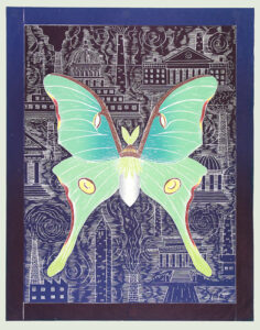 The artist’s method of working is unique: Multiple sections skillfully cut on the band saw are fitted together with puzzle-like precision to create the woodblock. Once assembled, Buck incises the woodblock with a number of tools to achieve a shallow relief. It is necessary to carefully print layers by hand both because of the intricate detail and scale of the work.