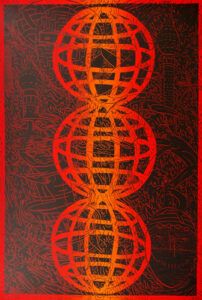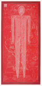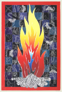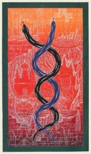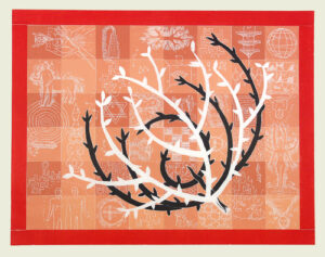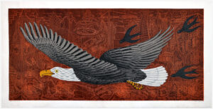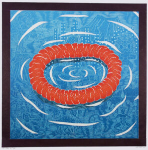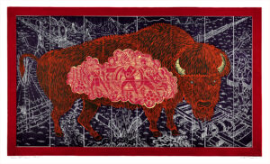 A large graphic figure in the foreground surrounded by a field of smaller elements is a common visual scheme in the artist’s prints. Taken from the daily news, his own sculpture, and nature, John Buck’s imagery captivates the viewer with its graphic boldness and, upon closer inspection, serves as a springboard for conversations about the world and our place within it.